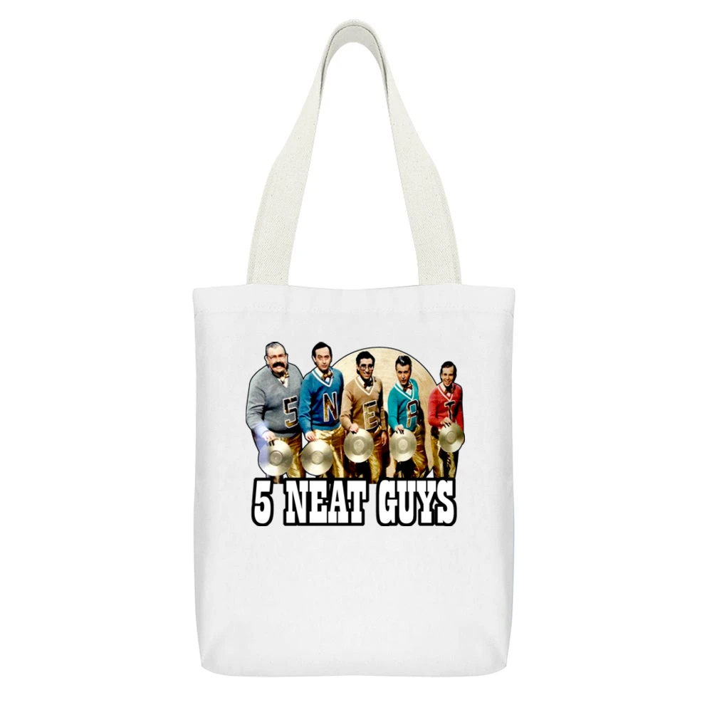 Introducing the 5 Neat Guys Sctv Candy Levy Moranis Canvas Tote Bag, a delightful blend of artistic expression and practical functionality. This canvas tote bag showcases a unique design inspired by the iconic characters from SCTV, making it a standout accessory for any fan. Perfect for daily use, this tote combines style with sustainability.