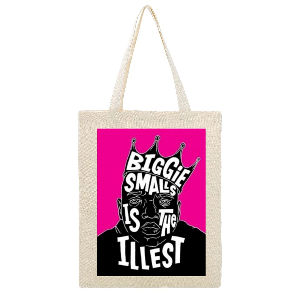 The Biggie Illist design is rooted in the rich culture of hip-hop and pays homage to one of its greatest icons. With a brilliant pink background, the artwork captures the essence of Biggie’s larger-than-life persona, combining bold colors and intricate illustrations that will turn heads wherever you go. Whether you’re heading to a concert, a casual outing, or just running errands, this tote bag not only showcases your appreciation for music but also adds a touch of style to your everyday look.
