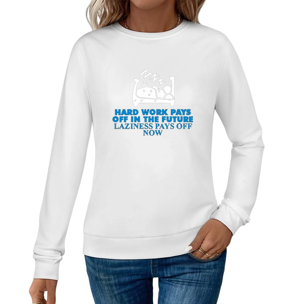 The graphic design of this sweatshirt centers on the captivating phrase, “Hard Work Pays Off in the Future, Laziness Pays Off Now.” Designed with a modern aesthetic, this text-based art serves as a daily reminder to embrace diligence and hard work while highlighting the allure of immediate gratification. Created for those who balance ambition with relaxation, this sweatshirt embodies an ethos that resonates across generations.