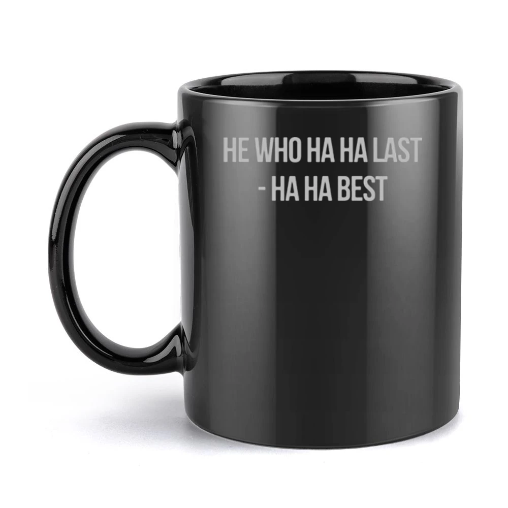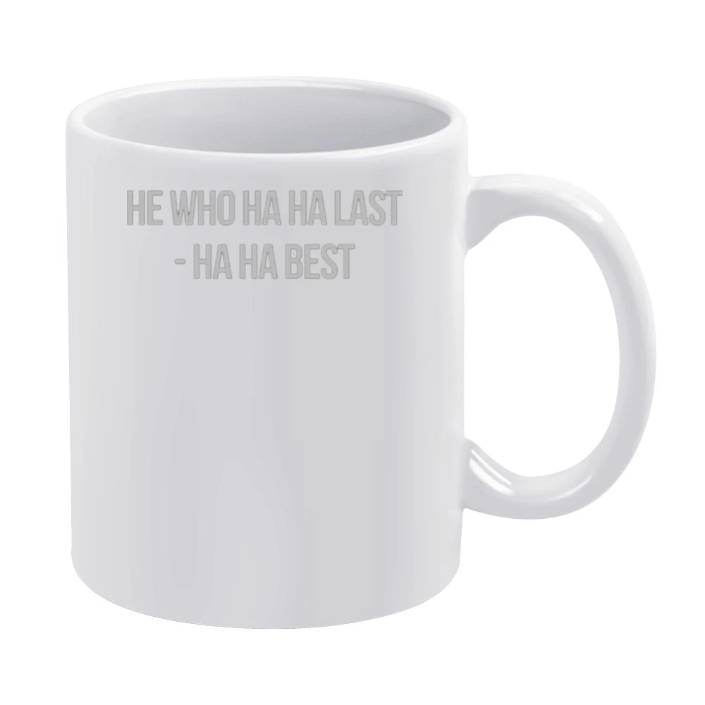 Introducing the “He Who Ha Ha Last – Ha Ha Best” funny mug, the perfect blend of humor and practicality for coffee lovers! This uniquely designed ceramic coffee mug not only serves its purpose of delivering your favorite beverages but also adds a witty touch to your daily routine.