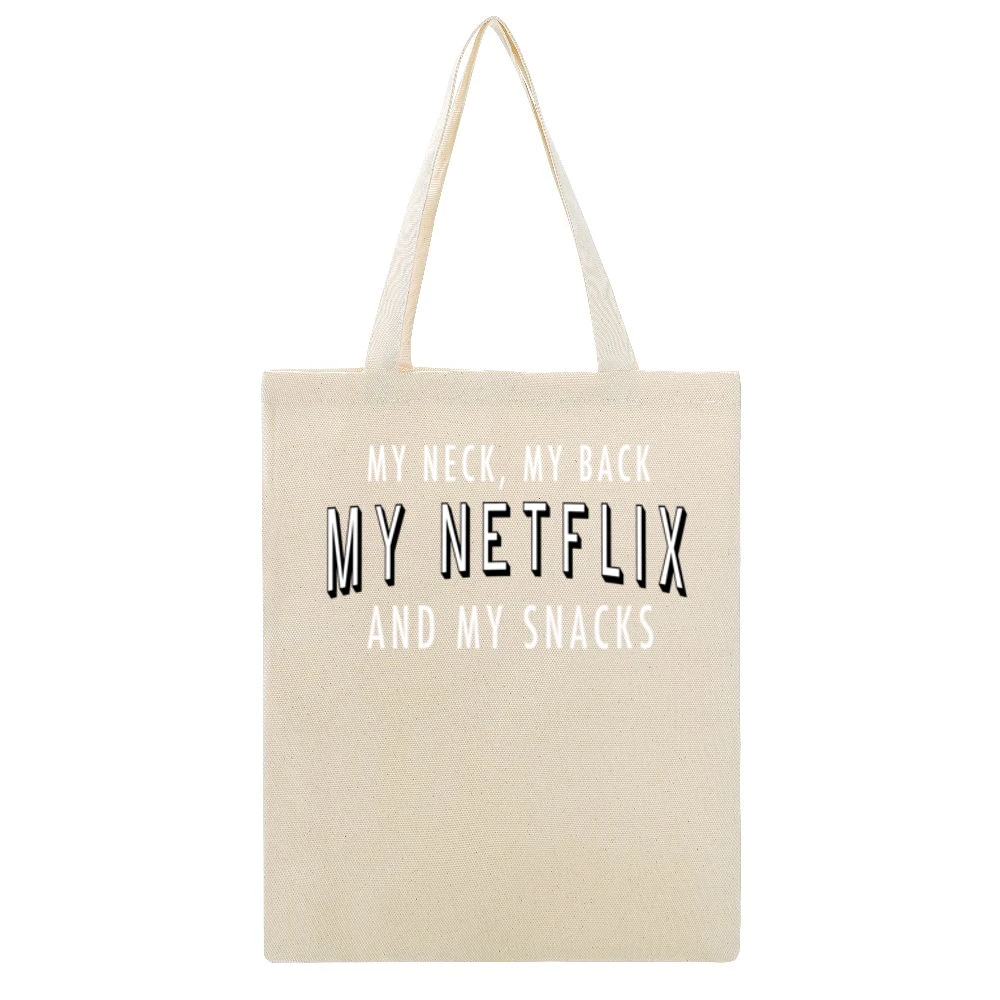The My Neck My Back My Netflix And My Snacks Fun TV Binge Watching Canvas Tote Bag is not just about style; it’s about functionality too. With sturdy straps, it offers comfortable carrying for your groceries or favorite books. The lightweight material means it’s easy to fold and store away when not in use, making it an ideal choice for those who appreciate convenience.