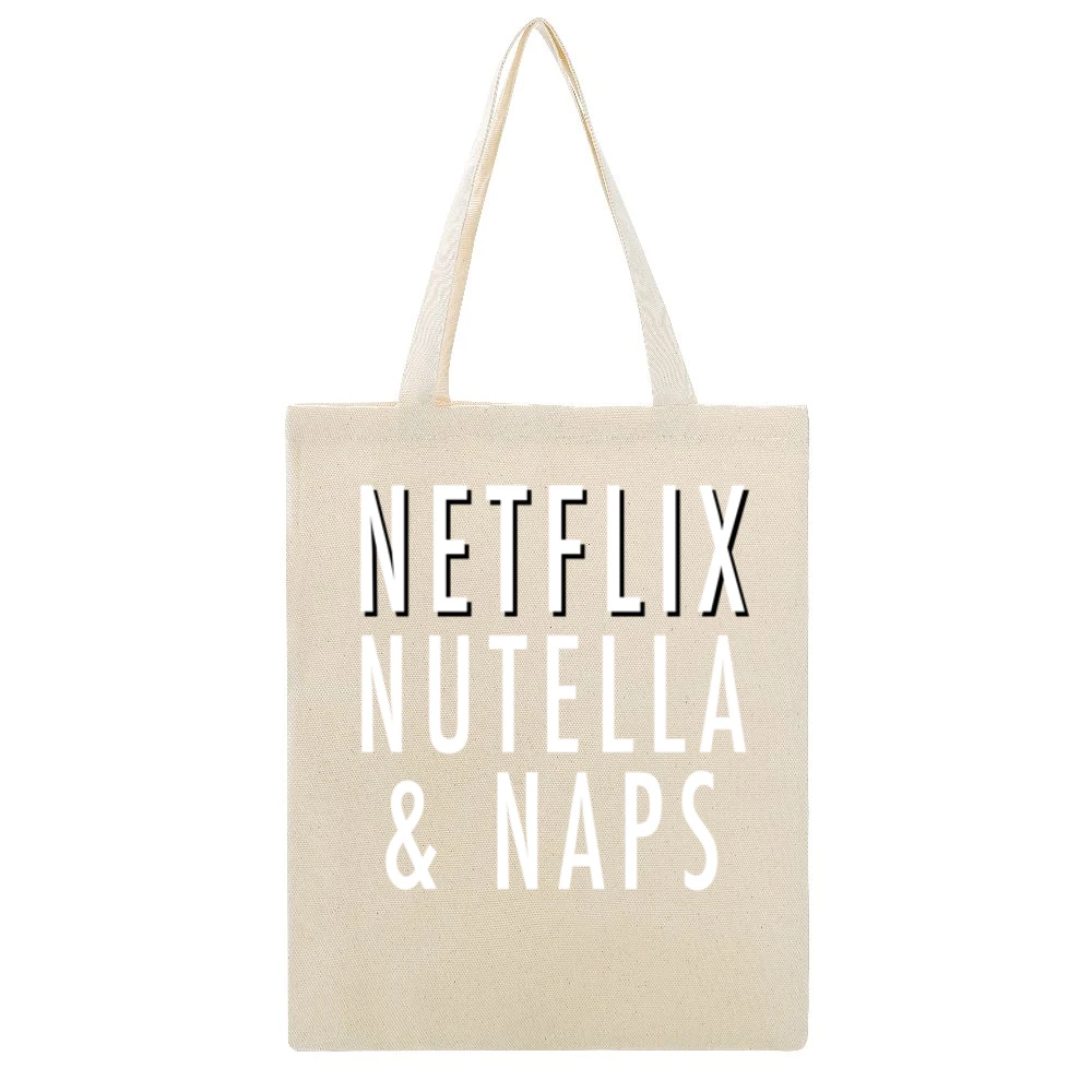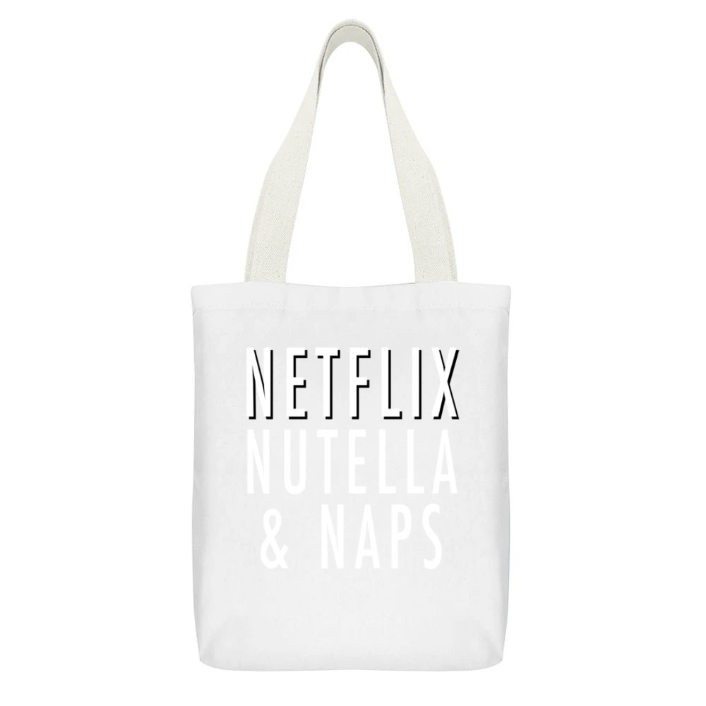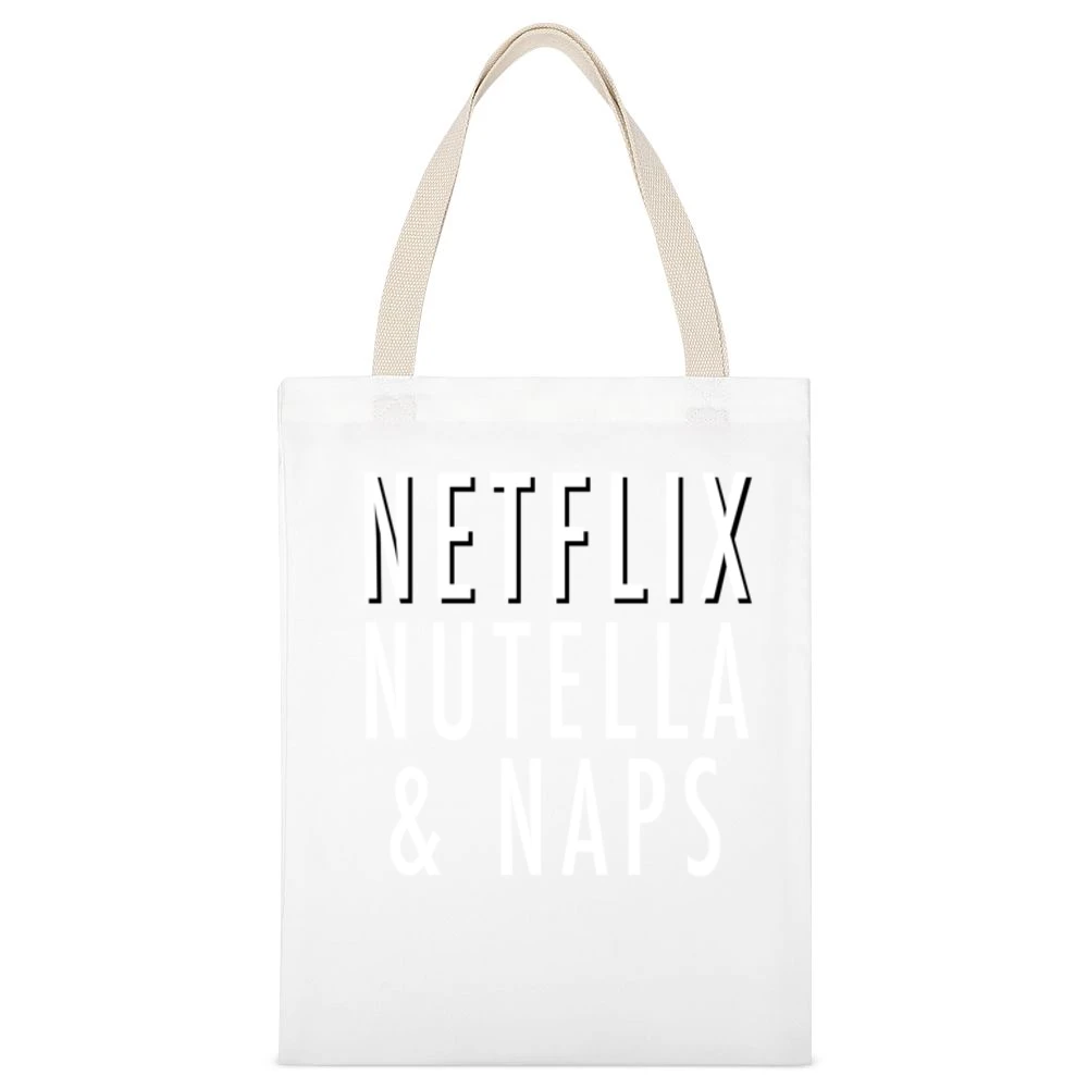Moreover, this tote bag also promotes an eco-friendly alternative to plastic bags, making it an excellent choice for environmentally conscious consumers looking to reduce waste. With the Netflix Nutella and Naps Funny Binge Watch TV Food Canvas Tote Bag, you can make a statement not just about your love for cozy evenings but also about your commitment to sustainability.