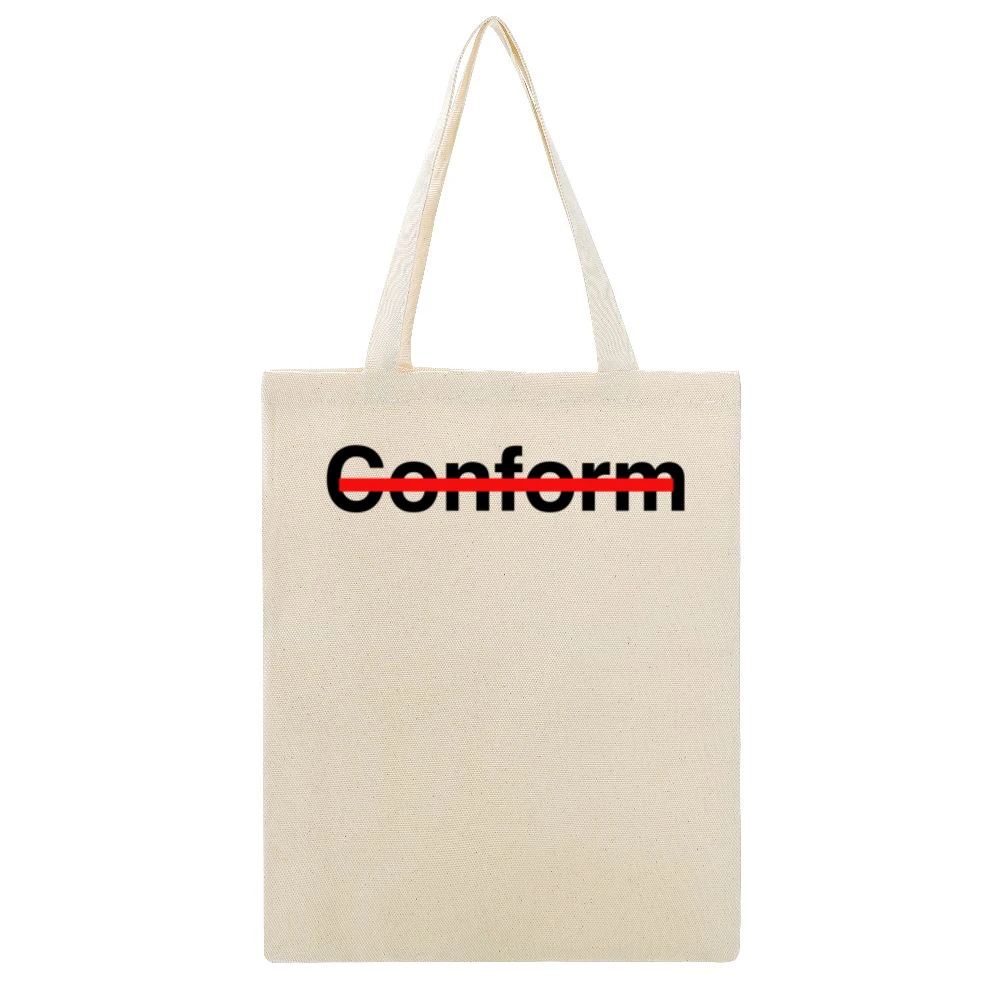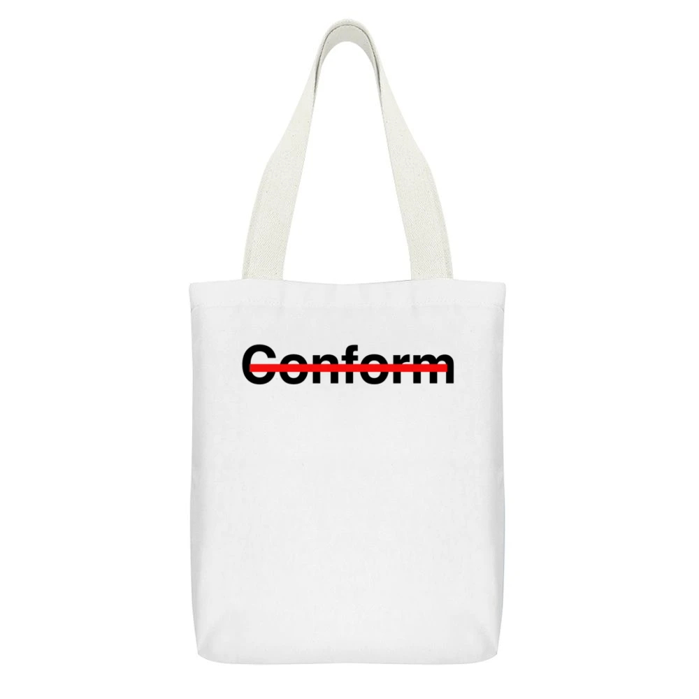 In conclusion, the Never Conform Crossed Out Red Line Canvas Tote Bag is more than just a bag; it’s a powerful symbol of resistance against conformity. Make a bold statement about who you are and what you stand for. Add this stunning canvas tote bag to your collection today, and showcase your commitment to living life on your own terms.