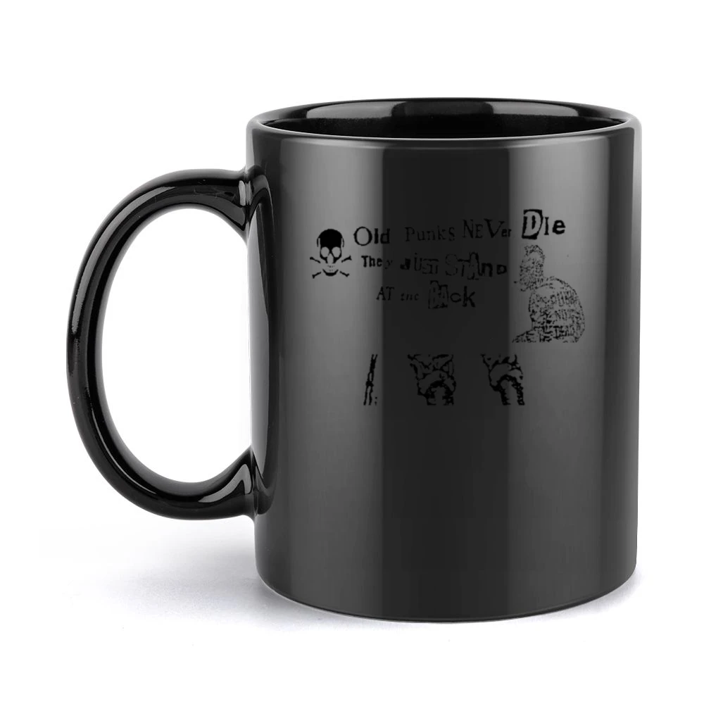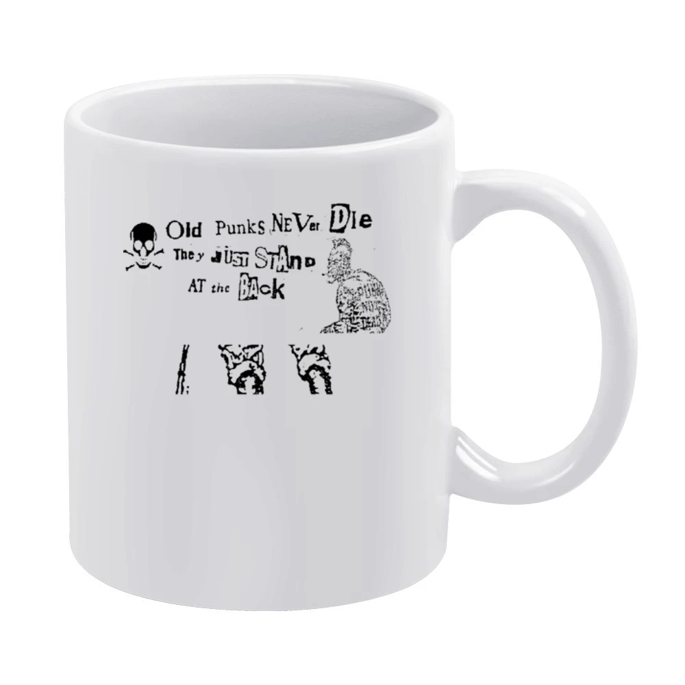 Introducing our Old Punk Never Die They Just Stand at the Back Mug, a perfect blend of attitude and functionality. This ceramic coffee mug not only features a bold and rebellious design but is also crafted for durability, making it an ideal companion for your daily caffeine fix.