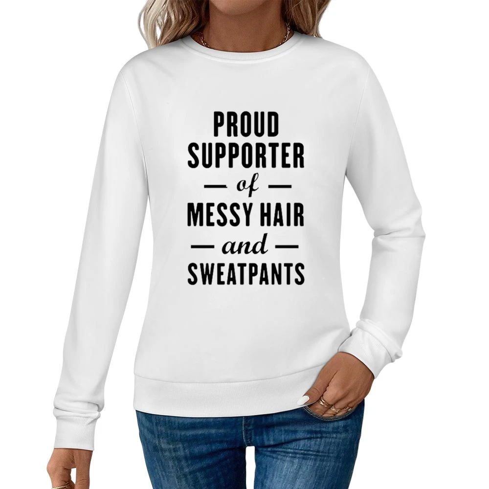 Introducing the ultimate expression of comfort and style: the Proud Supporter Of Messy Hair And Sweatpants Fun Graphic Tee Shirt Pullover Sweatshirt. This trendy apparel piece blends a playful graphic design with the functionality of a cozy pullover, making it the perfect choice for both relaxation at home and casual outings.
