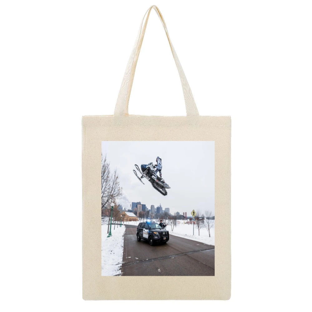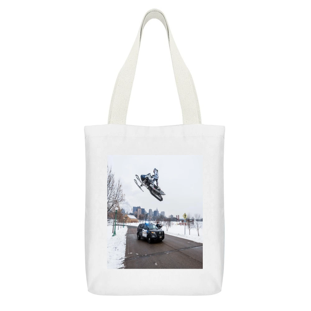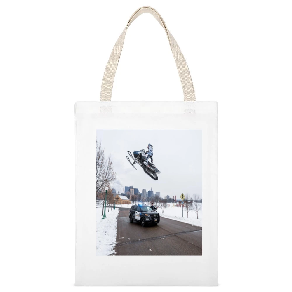 Not only is this Snowmobile Sled Jump Cop Tshirt a wardrobe staple, but it also calls attention to your adventurous spirit. Ideal for casual outings, winter sports events, or even as a conversation starter at gatherings, this t-shirt serves multiple purposes. Plus, our canvas tote bag makes a perfect addition, allowing you to carry your essentials in style while showcasing the same energetic design. Whether you’re heading to the gym, the beach, or just running errands, this tote provides functionality without compromising on style.