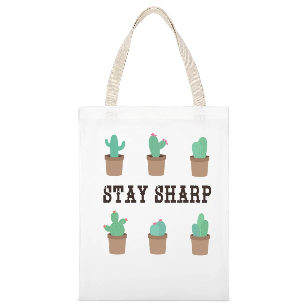 Invest in your style and practicality with the Stay Sharp Fun Cute Cactus Graphic T-shirt Canvas Tote Bag. Perfect for eco-friendly shopping experiences or as a trendy everyday accessory, it truly checks all the boxes. Grab yours today and let your personality shine while you stay sharp and chic wherever life takes you!