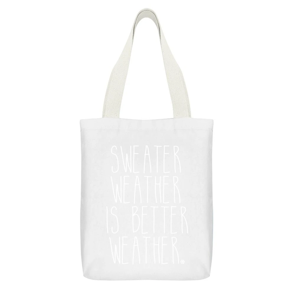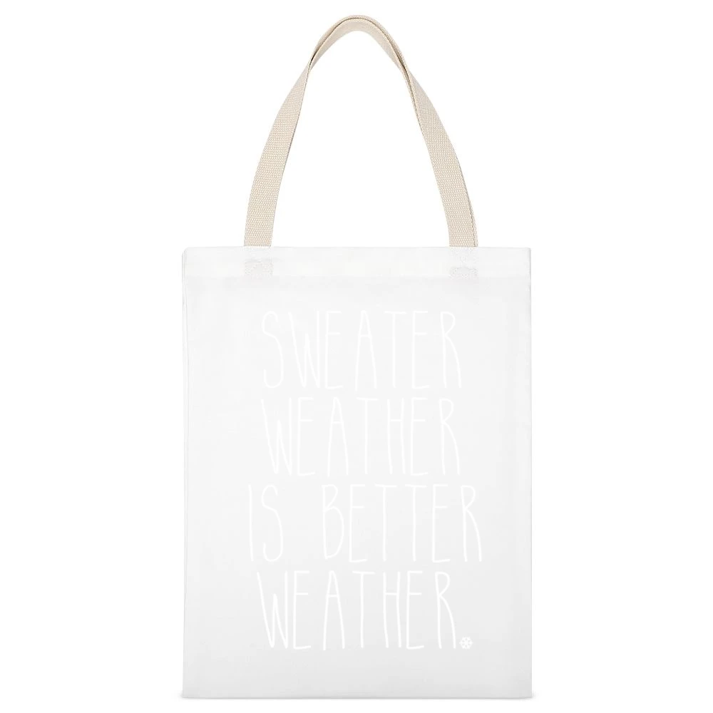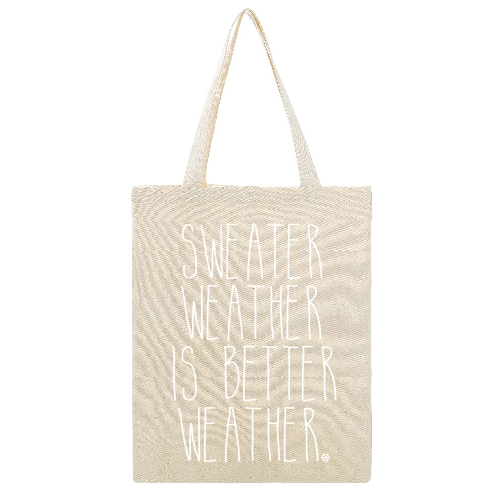 The eye-catching phrase “Sweater Weather Is Better Weather” embodies the allure of cozy winter days spent in warm sweaters, surrounded by soft blankets and falling snow. Each tote is adorned with playful typography that brings a sense of fun and nostalgia, making it an excellent choice for winter gatherings or a casual day out. The design draws inspiration from classic winter motifs, combining festive cheer with a modern aesthetic that appeals to all ages.