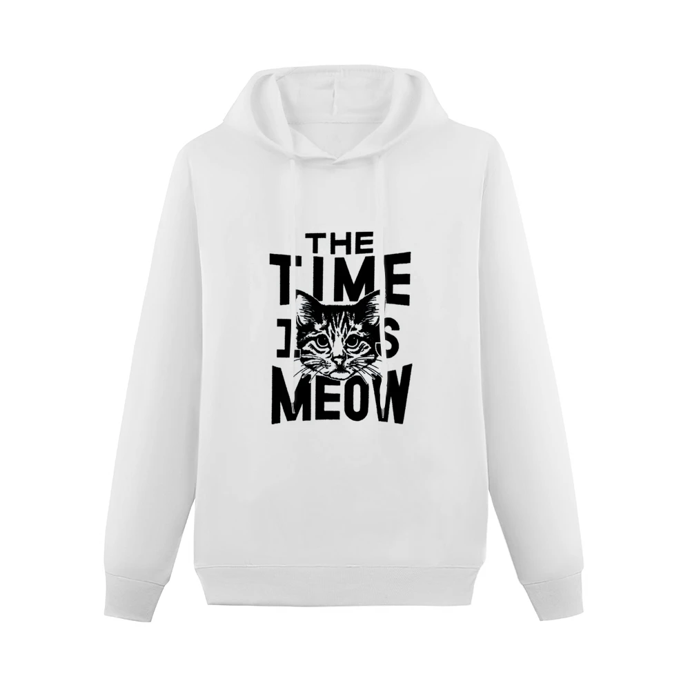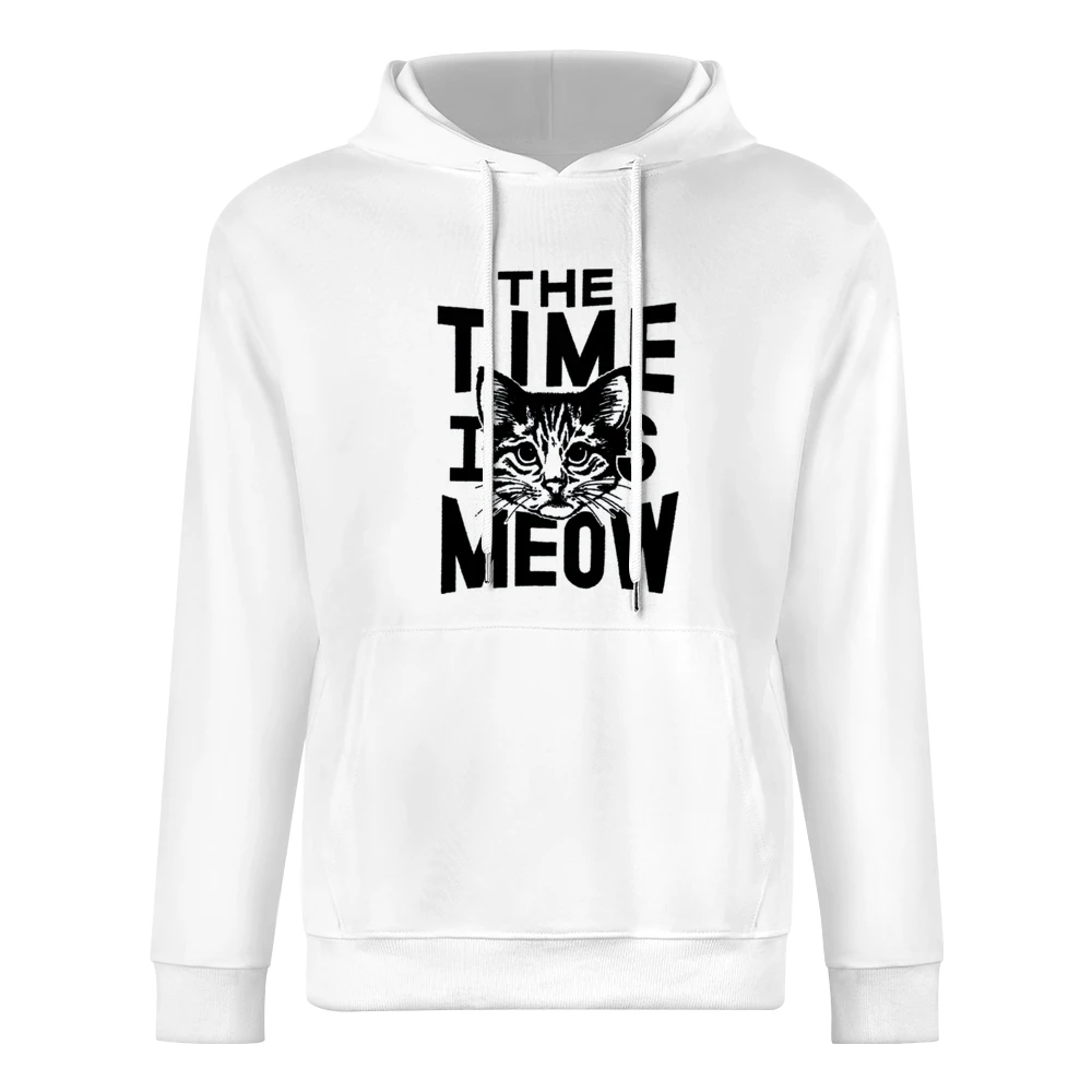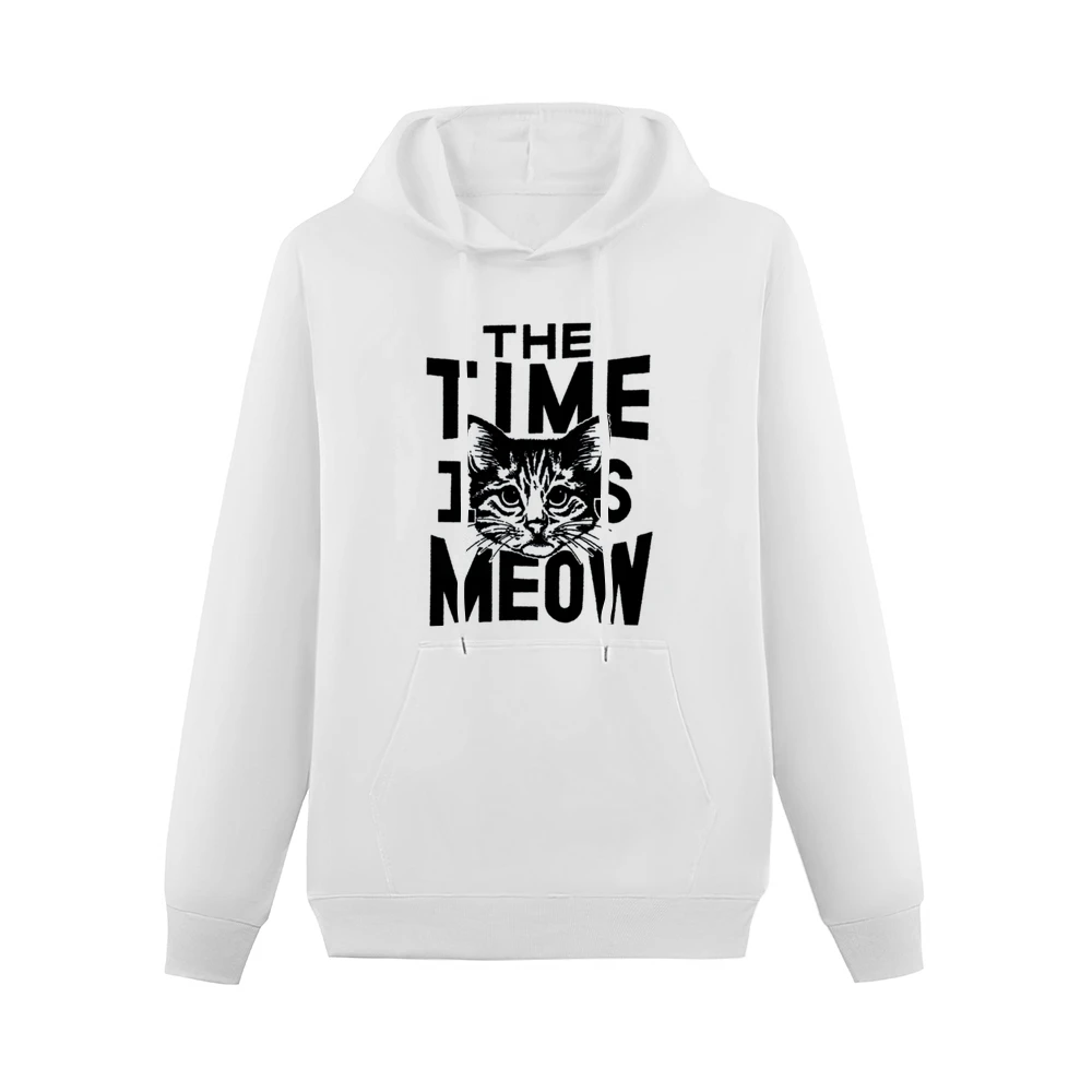 The focal point of this hoodie is its delightful graphic, “The Time Is Meow,” which captures the playful spirit of cats. Drawing inspiration from the rich history of feline representation in art, this design uses a modern and captivating typography that resonates with both casual and devoted cat lovers. Whether you’re lounging at home, participating in a cat-themed event, or enjoying a day out, this hoodie sends a clear message that every moment is a cat moment!