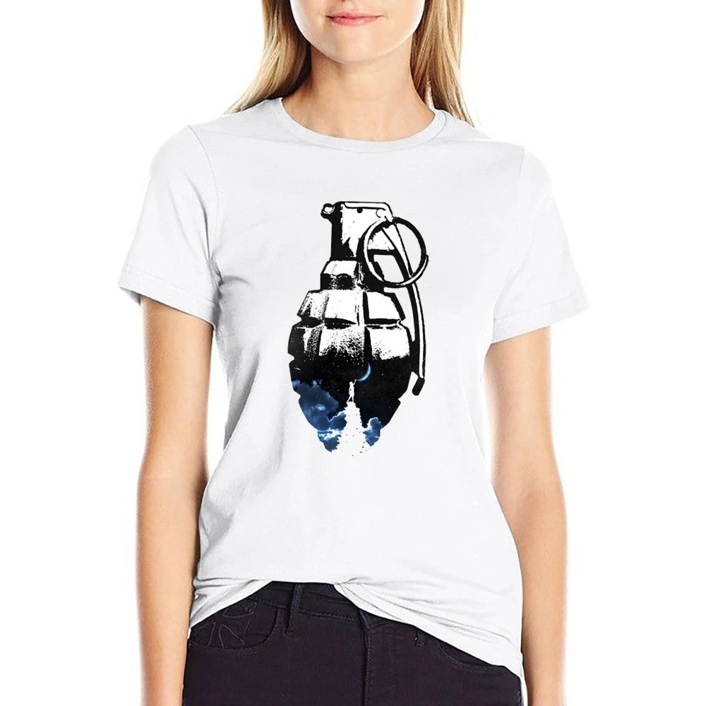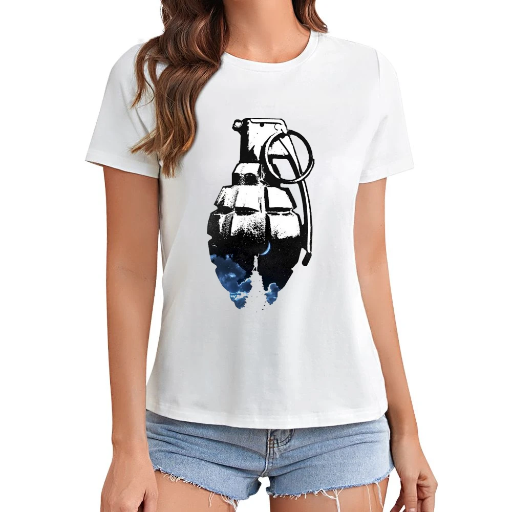 Introducing the Touching the Moon Grenade T-Shirt, a captivating blend of imagination and comfort. This unique design features a stunning visual representation of an exploding grenade intertwined with celestial elements, giving it a surreal, artistic flair that stands out in any crowd.