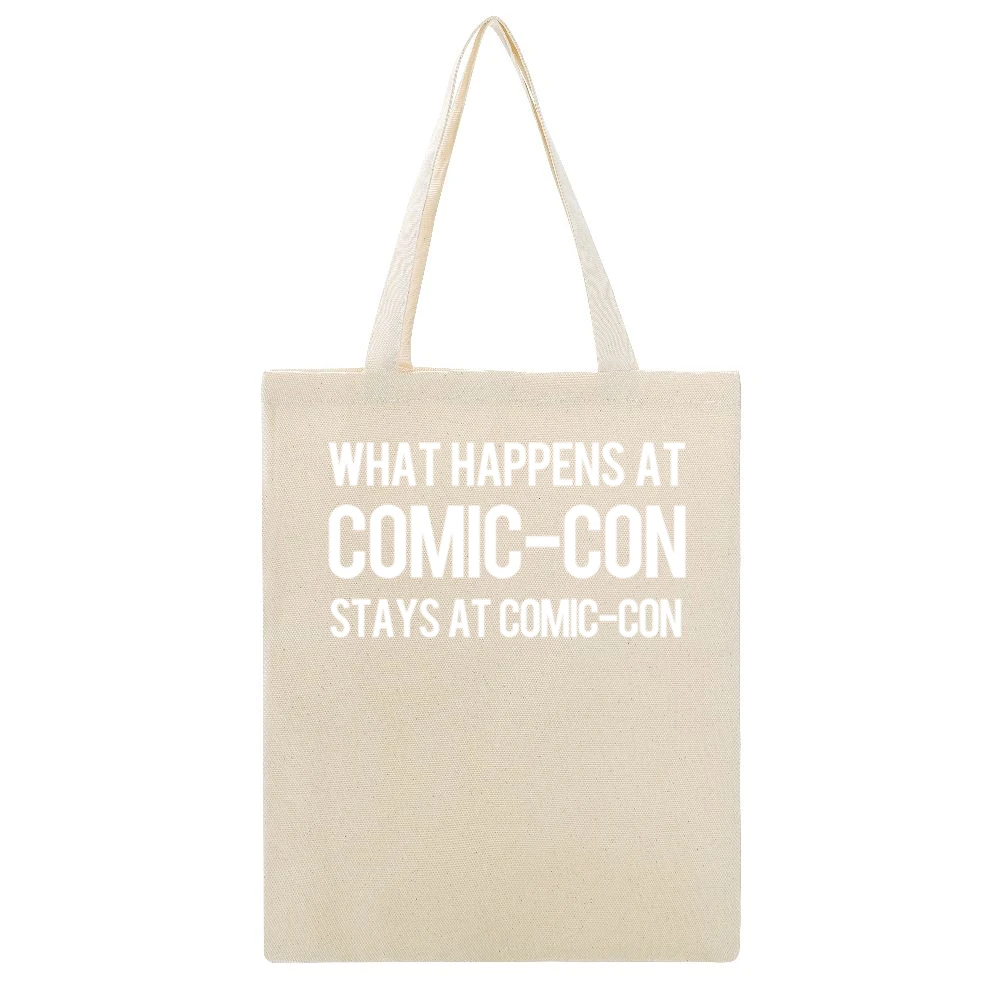 Introducing our “What Happens At Comic Con Stays At Comic Con” Funny Cool Geek Nerd Canvas Tote Bag, the ultimate accessory for comic book fans and pop culture enthusiasts! Featuring a quirky and humorous design, this tote bag is perfect for showcasing your love of all things nerdy while being practical for everyday use.