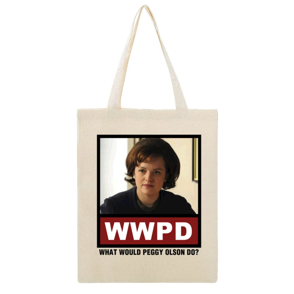 Introducing the What Would Peggy Olson Do WWPD Mad Men Canvas Tote Bag—a perfect blend of style and practicality, inspired by the iconic character from the beloved series, Mad Men. This canvas tote showcases a unique design that stands out, making it not just a bag, but a conversation starter.