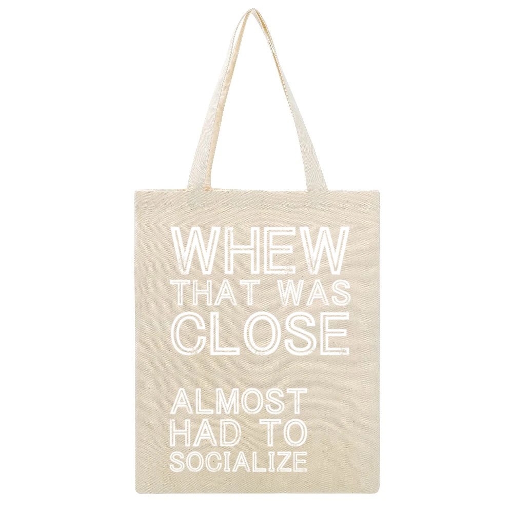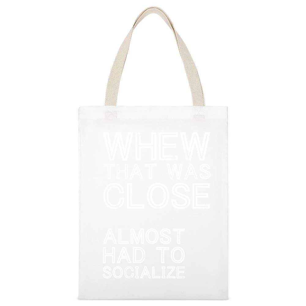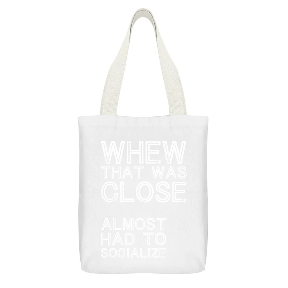 Introducing the ultimate conversation starter, the Whew That Was Close Almost Had To Socialize Funny Introvert Canvas Tote Bag. This uniquely designed canvas tote bag not only makes a bold statement but also perfectly combines practicality and humor for introverts everywhere.