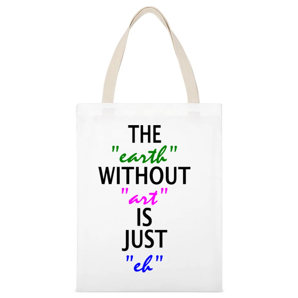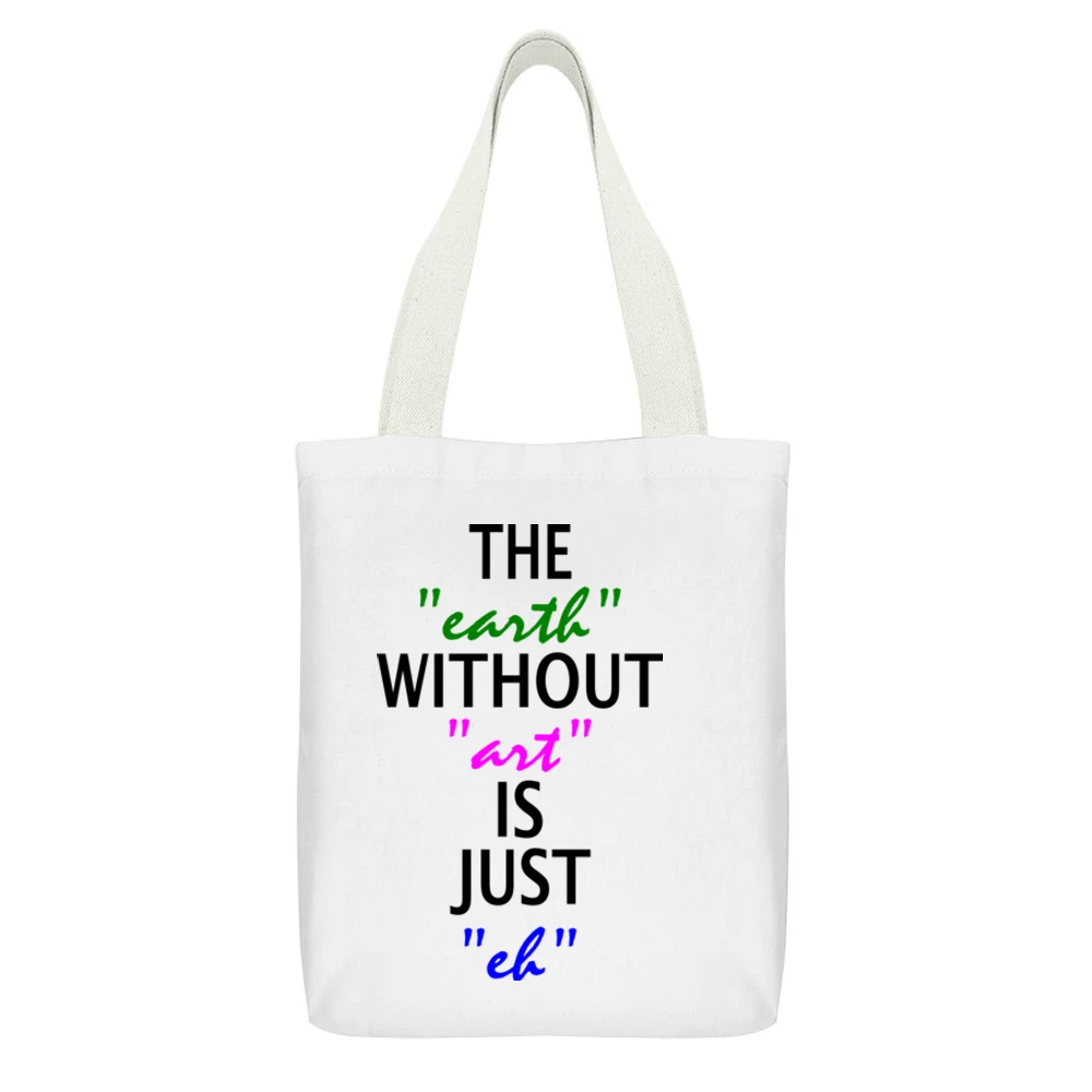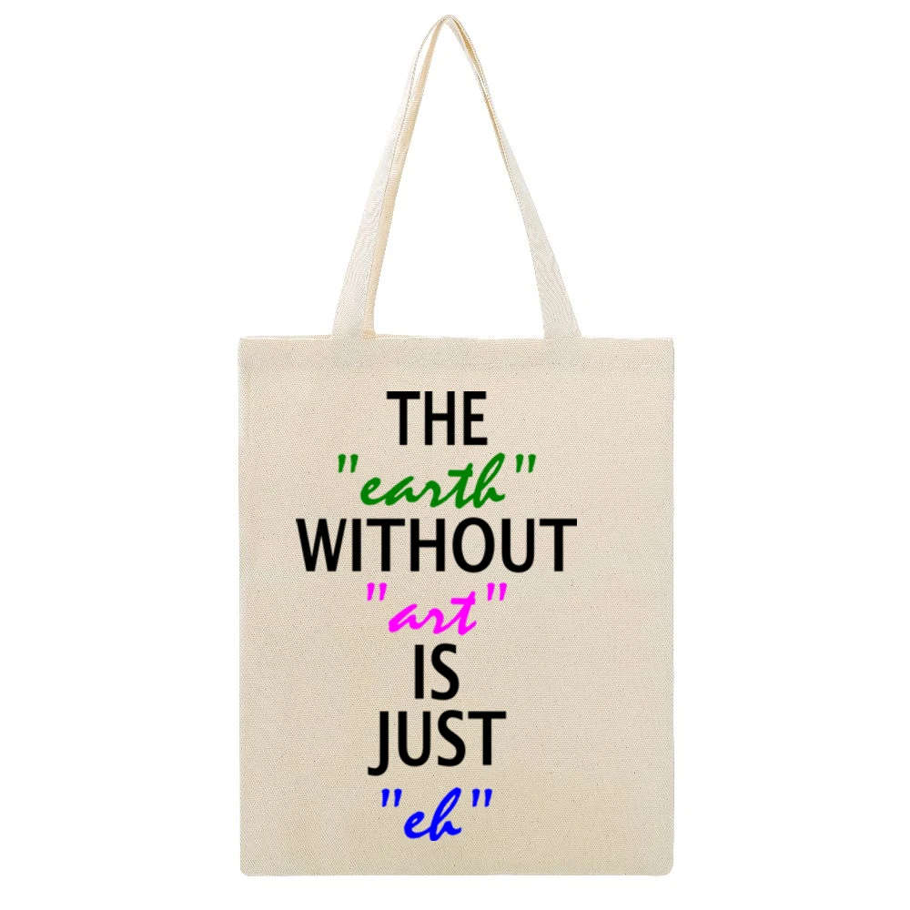 Crafted with high-quality canvas, this tote is not only stylish but also durable. The eye-catching design, which boldly states “Without Art the Earth is just eh,” encapsulates the vibrancy and creativity that art brings to our world. The minimalist typography paired with artistic flair makes this tote perfect for any art lover or creative soul.